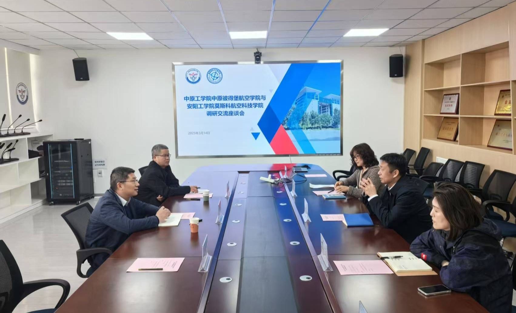 涂晓韦介绍了双方参会人员。轩信飞致欢迎辞,代表学院对王伟一行的到访表示热烈欢迎,并详细介绍了学院的发展历程、学科特色及中俄合作办学成果,重点分享了学院党建工作的创新实践。双方围绕中俄合作办学模式、师资配备、学生俄语学习等议题展开深入交流。安阳工学院莫斯科航空科技学院党总支副书记姚战军表示,中原彼得堡航空学院的顶层设计与办学经验具有重要借鉴意义,期待未来在航空科技领域深化合作,相互交流借鉴。