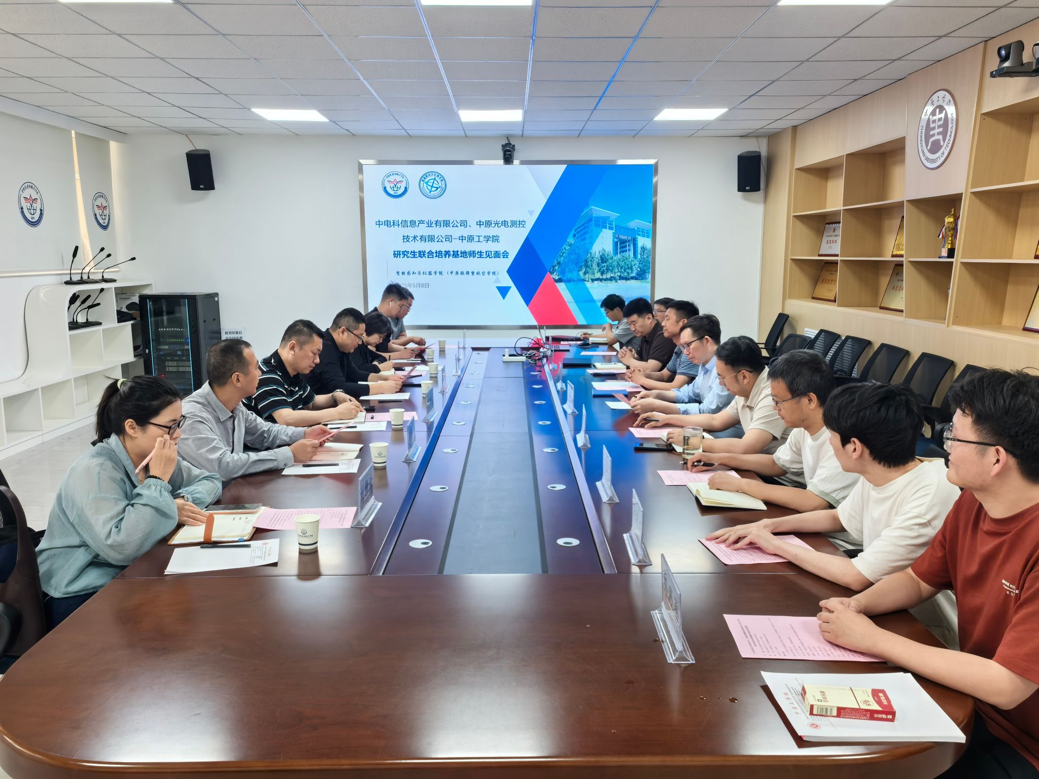 研究生联合培养基地师生见面会在龙湖校区举行。中电科信息产业有限公司党总支书记、常务副经理李明、中原光电测控技术有限公司党总支书记、副总经理韩靓、中国电子科技集团第27研究所重点实验室党总支书记田晓军、中原彼得堡航空学院党总支书记轩信飞、色花堂