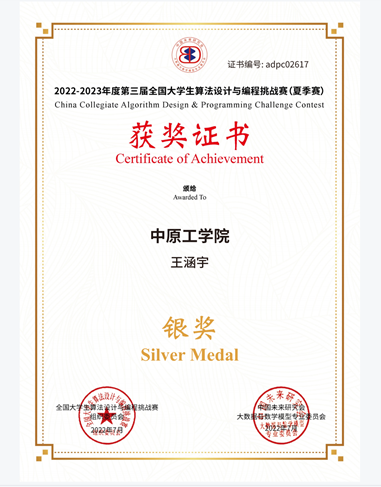 2022年第三届全国大学生算法设计与编程挑战赛(夏季赛)是航空学院软件工程专业学生第一次参加的比赛,该项赛事由全国大学生算法设计与编程挑战赛组委会、中国未来研究会(国家一级学会)大数据与数学模型专业委员会主办,共有823所高校2000多支队伍近6000人报名参赛。其中参赛高校覆盖北京大学、清华大学、上海交通大学、中央财经大学、西安交通大学、中国人民大学、同济大学、华中科技大学、北京航空航天大学等的39所985高校和103所211高校。软件20级学生王涵宇一举斩获大赛银奖,反映出了航空学院学子扎实的专业知识和技能等基本功。